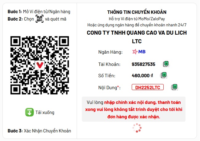 Lưu ý: Quý khách hàng vui lòng kiểm tra chính xác thông tin tài khoản “ CONG TY TNHH QUANG CAO VÀ DU LICH LTC” trước khi xác nhận thanh toán