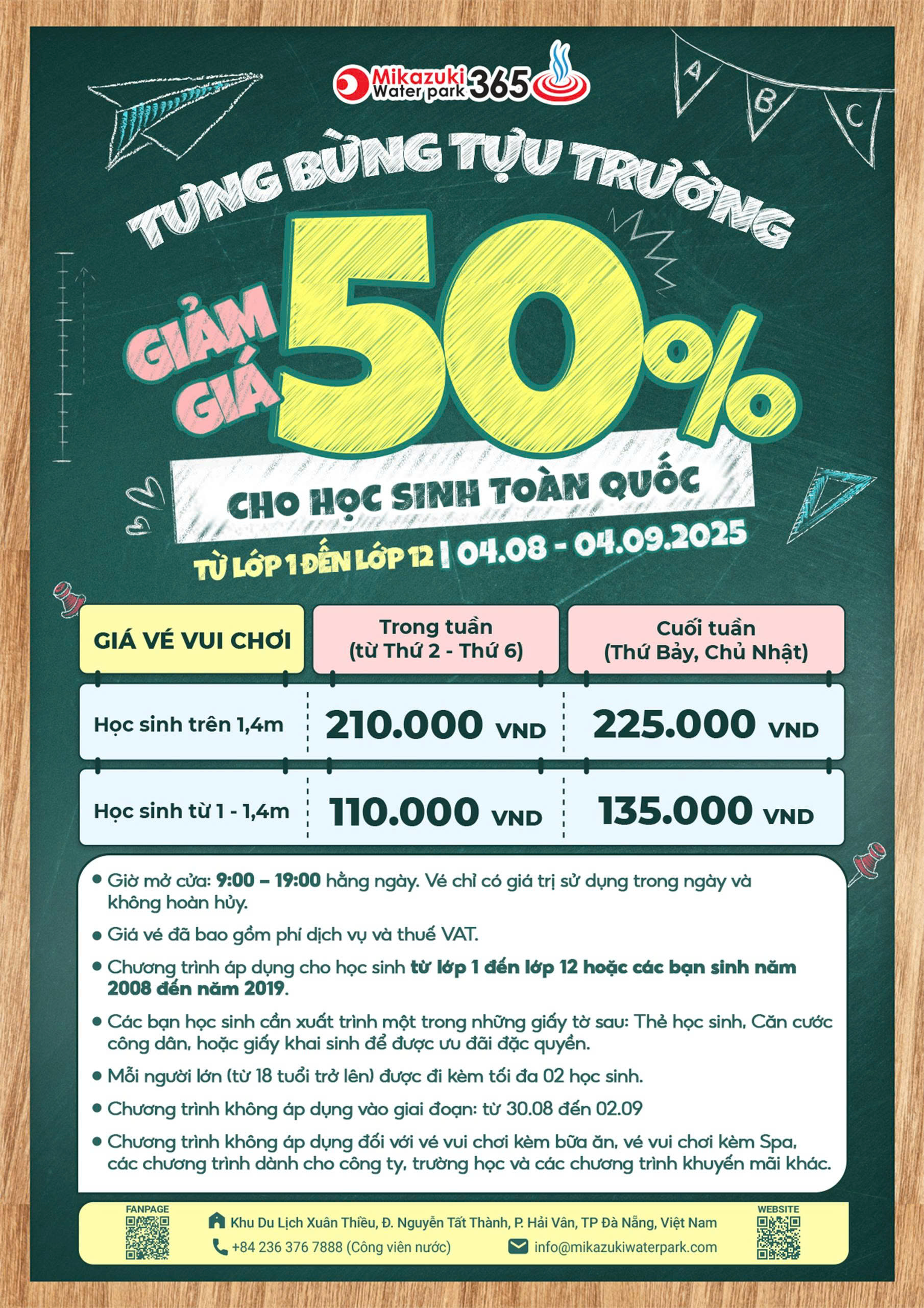 Từ ngày 04/08 đến 04/09/2025, Mikazuki Waterpark Đà Nẵng triển khai chương trình ưu đãi đặc biệt dành riêng cho học sinh trên toàn quốc. Đây là cơ hội tuyệt vời để sở hữu vé học sinh Mikazuki Waterpark với mức giá hấp dẫn, giúp các em nhỏ khép lại mùa hè một cách đáng nhớ.